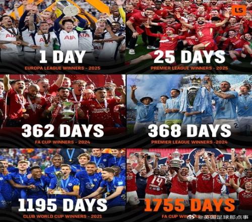 英超big6距离上次夺冠的时间切尔西1195天,阿森纳1755天